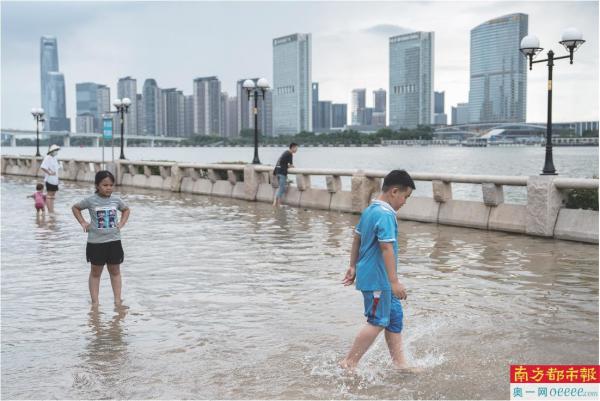 昨日上午11时许,广州迎来天文大潮,小朋友在亲水平台感受珠江水涨的乐趣。南都拍客 吴文军 摄