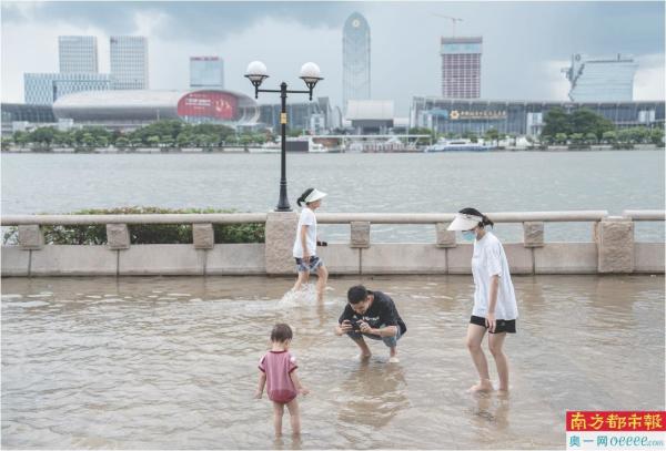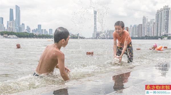 家长带着小朋友在珠江边戏水。