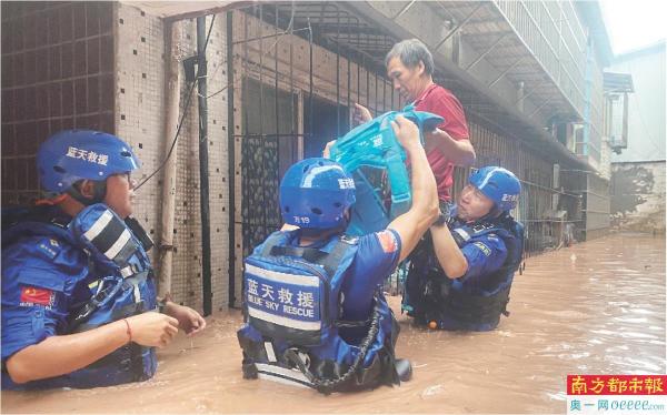 7月4日,蓝天救援队队员在重庆市万州区五桥街道转移被困群众。