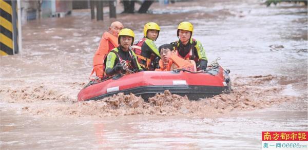 7月4日,重庆万州区五桥街道,消防员用冲锋舟转运被困群众。
