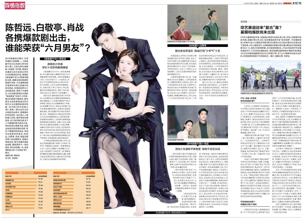 在6月剧集排行榜中,引领热度前三的剧集——《偷偷藏不住》《长风渡》《梦中的那片海》,分别为现代偶像剧、古装剧、年代剧,都是在未播前已经引起观众热烈讨论和期待的作品。榜首的《偷偷藏不住》以青春纯爱的主题,温暖治愈的氛围持续攀升热度,少女桑稚的暗恋情愫和与男主段嘉许的双向奔赴,所塑造的梦幻十足的童话感,俘获了大量观众。《长风渡》因两位主角的“假戏真做”引起不小热度,播出后剧情节奏明快,剧中男女主的形象塑造也符合现代大众对爱情的美好想象。年代剧《梦中的那片海》,聚焦一群生活在北京大院的热血青年,致敬缅怀时代的同时,也凸显小人物的奋斗历程。虽然类型风格各异,但三部热剧均由当下人气爆棚的青年演员主演,同时呈现出青春洋溢、甜宠治愈或热血燃情的风格,呼应了暑期档即将来临,市场对此类题材的渴求。陈哲远、白敬亭、肖战,都是近期荧屏上的宝藏男生,颜值与演技在线,敢于突破自我拓宽戏路,解锁更多不一样的角色。他们中的哪一位,是深得剧迷心的“六月男友”呢?