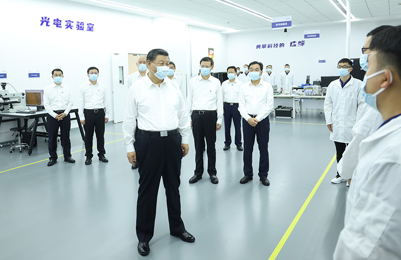 随后,习近平来到苏州华兴源创科技股份有限公司考察。习近平走进展厅、研发车间、光电实验室,察看产品研发、生产、测试流程,询问企业设备产品的性能、用途、市场等情况。看到企业研发人员都是年轻人,习近平十分欣慰。他说,国家现代化建设为年轻人提供了广阔舞台,大家正当其时,要把握历史机遇,大显身手,勇攀科技高峰,将来你们一定会为自己对民族复兴所作的贡献而自豪。