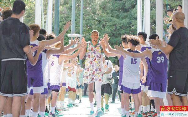 7月5日,NBA密尔沃基雄鹿队当家球星、“字母哥”阿德托昆博现身广州天体篮球场,与广州球迷亲密互动,受到夹道欢迎。 南都记者 黎湛均 摄