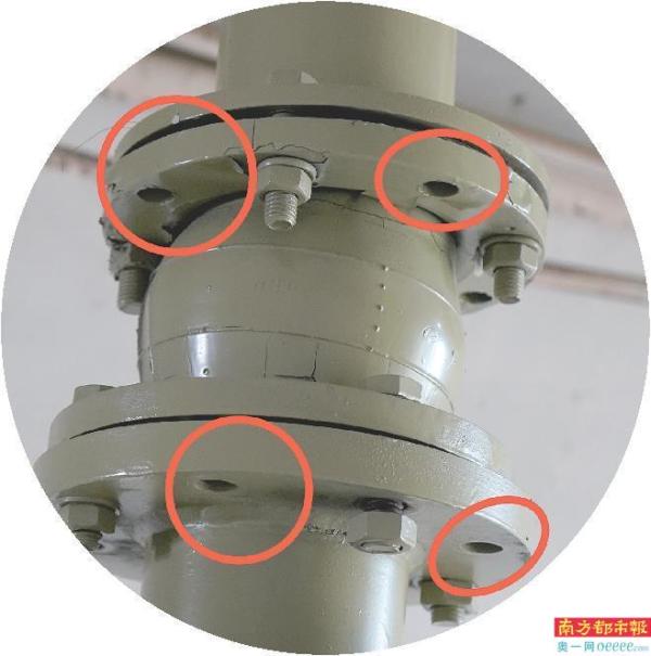 检查组专家指出,海丰珠江啤酒分装有限公司鼓风机管道法兰盘螺栓未上满,需立即整改。
