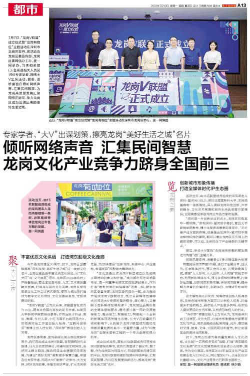 7月7日,“龙岗V联盟”成立仪式暨“龙岗有咖位”主题活动在深圳市龙岗区举行。