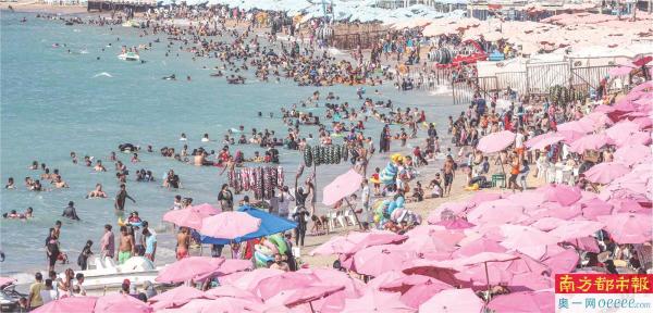 7月6日,人们在埃及亚历山大的海边游玩消暑。