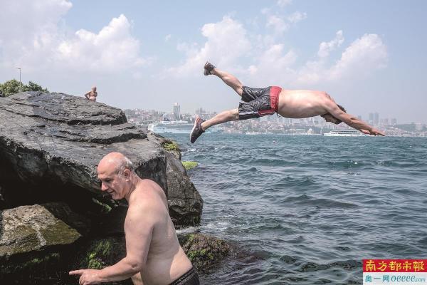 7月11日,在土耳其伊斯坦布尔,一名男子跳入海中游泳。