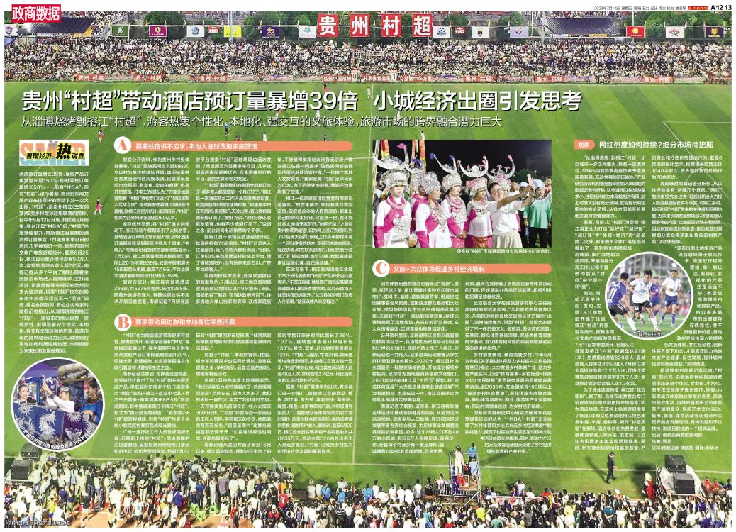 酒店预订量增长39倍、度假产品订单量增长超150%、即时零售订单量增长50%……前有“村BA”,后有“村超”,这个暑期,贵州黔东南文旅产业在体育IP的带动下又一次火出圈。“村超”,是贵州榕江(三宝侗寨)和美乡村足球超级联赛的简称,自今年5月13日开场,持续至8月结束。继台江县“村BA”后,“村超”热度持续攀升,带动榕江县暑期的酒店预订量暴增,7月逢赛事举办日的房间几乎被预订一空。据黔东南州文体广电旅游局统计,截至6月25日,榕江县已累计接待游客50万人次,实现旅游综合收入超2亿元。南都记者从多个平台了解到,随着全国旅游市场进入暑期旺季,主打清凉游、避暑度假等关键词的贵州迎来大量游客,搭乘“村超”快车的黔东南州热度已超过五一“顶流”淄博,排名全国前列。多位业内专家对南都记者指出,从淄博烧烤到榕江“村超”,一座城市的爆火具有一定偶然性,说明游客对个性化、本地化、强交互文旅体验的热衷,旅游市场的跨界融合潜力巨大。政府则应思考如何利用短期热度,未雨绸缪为未来长期发展做规划。