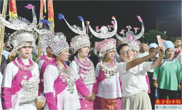 游客在“村超”足球赛现场与少数民族拉拉队合影。