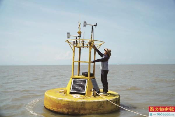 7月15日,受台风“泰利”影响,为确保琼州海峡北岸海域气象观测设备正常监测和传输数据,广东湛江市气象技术人员前往浮标站,检查各式观测仪器运行情况。 南都记者 陈辉 张德威 摄
