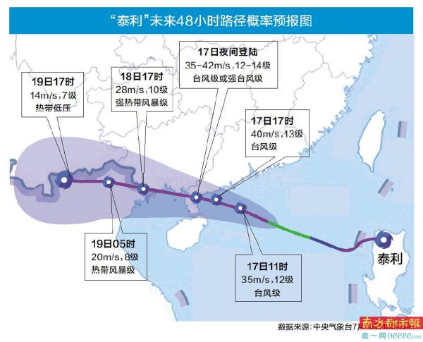 “目前,‘泰利’还在缓慢发展中,台风云系结构逐渐紧实,南侧和西侧风雨较强。由于华南近海海温条件好,未来24小时是它的黄金发展期,其强度可能在近海快速增强,达到台风至强台风级别。”石妍介绍,台风“泰利”将成为今年首个登陆我国的台风,从目前天气形势来看,17日夜间最大可能在广东雷州半岛登陆。