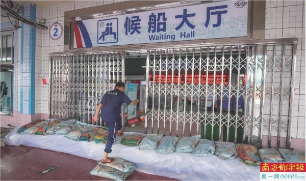 7月16日,海南海口秀英港的候船大厅入口已堆放防洪沙袋,以防洪水入侵。 IC供图