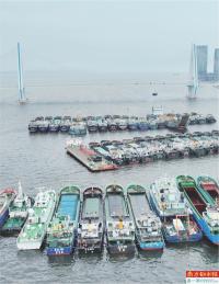 位于琼州海峡一侧的海南海口世纪大桥下出海船舶回港避风。