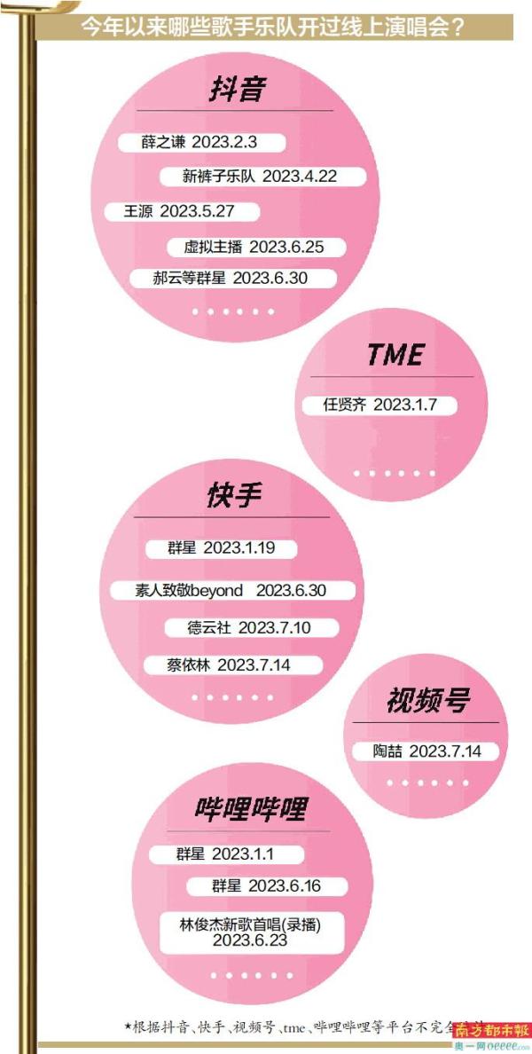 就在今年初,中演协调研指出,60%的从业机构表示线下市场恢复后依然会尝试线上演出,半年过去,关于线上演唱会的数据呈现收缩态势。南都记者不完全梳理发现,上半年抖音、快手、视频号、tme、哔哩哔哩等已开播的线上演唱会包括歌友会、音乐会、演唱会等有百余场,包括薛之谦、新裤子乐队、王源、任贤齐、Beyond等知名乐队和歌手。