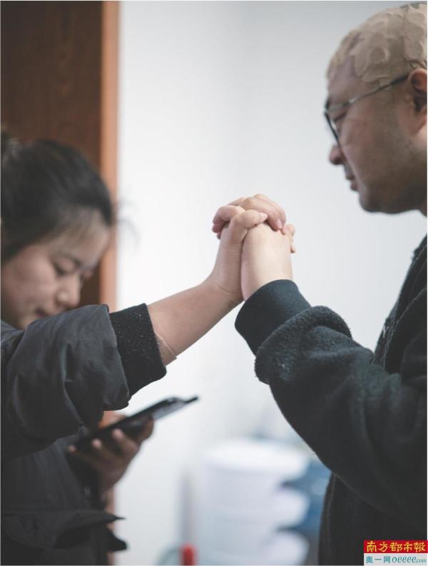 2023年3月16日晚上,即将前往新家举行入伙仪式的孙玉丹(鱼蛋)和丈夫章哲宇(大叔),相互击掌为对方打气。