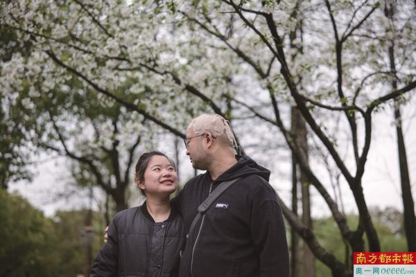 孙玉丹(鱼蛋)和丈夫章哲宇(大叔)在富春公园里。二人结婚不到一年,章哲宇被确诊胶质母细胞瘤,在2023年4月才补度蜜月。