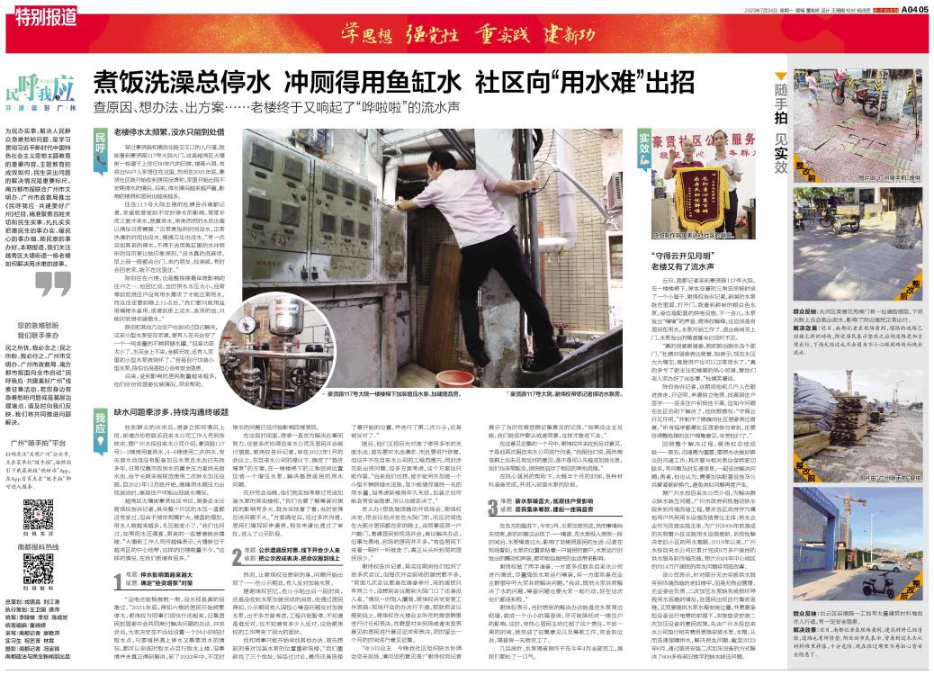 为民办实事,解决人民群众急难愁盼问题,是学习贯彻习近平新时代中国特色社会主义思想主题教育的重要内容。主题教育的成效如何,民生突出问题的解决情况是重要标尺。南方都市报联合广州市文明办、广州市政数局推出《民呼我应·共建美好广州》栏目,精准聚焦百姓关切和民生实事,扎扎实实把惠民生的事办实、暖民心的事办细、顺民意的事办好。本期报道,我们关注越秀区大塘街道一栋老楼如何解决用水难的故事。