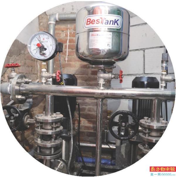 近日,南都记者来到豪贤路117号大院。在一楼楼梯下,原本空着的三角空间被封成了一个小屋子。谢炜权告诉记者,新装的水泵就在里面。打开门,就看到崭新的银白色水泵,旁边是配套的供电设施。不一会儿,水泵发出“嘀嘀”的声音。谢炜权解释,这应该是有居民在用水,水泵开始工作了。退出房间关上门,水泵发出的噪音基本已经听不见。