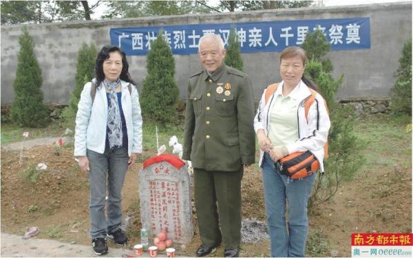 覃璐玲(左)和妹妹及覃汉坤的同军战友为覃汉坤扫墓。