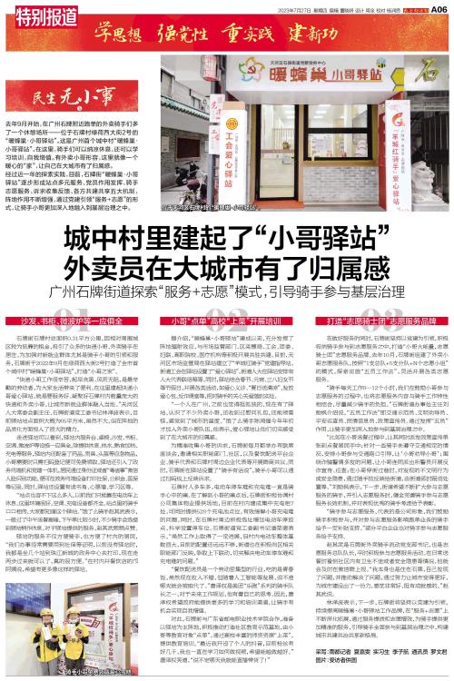 去年9月开始,在广州石牌附近跑单的外卖骑手们多了一个休憩场所——位于石牌村绿荷西大街2号的“暖蜂巢·小哥驿站”。这是广州首个城中村“暖蜂巢·小哥驿站”。
