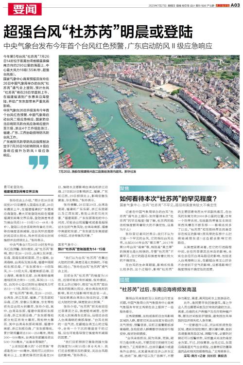 今年第5号台风“杜苏芮”7月26日14时位于距离台湾省鹅銮鼻偏南方向约290公里的海面上,中心最大风力16级(55米/秒,超强台风级)。