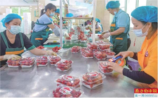 出口 6月27日,广州从化区太平镇一家农产品流通企业,流水线上的工人包装桂味荔枝出口。 南都拍客 吕华当 摄