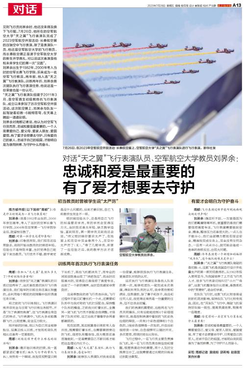 7月26日,他所在的空军航空大学“天之翼”飞行表演队完成了2023空军航空开放活动·长春航空展的压轴空中飞行表演。