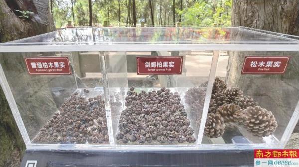 翠云廊古蜀道,现场陈列的柏木和松木果实。