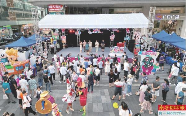 在舞台互动区,设有“你唱我猜”“幸运投壶”等互动游戏,市民们争相上台参与互动活动。舞台区旁的“红蓝球大挑战”“幸运翻翻乐”等互动摊位人气爆棚,精彩的互动游戏吸引了不少前来北京路逛街的年轻人群。