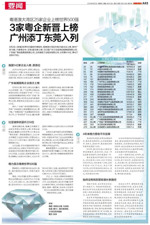 8月2日,《财富》世界500强排行榜发布,粤港澳大湾区共有25家企业上榜,其中广东19家。