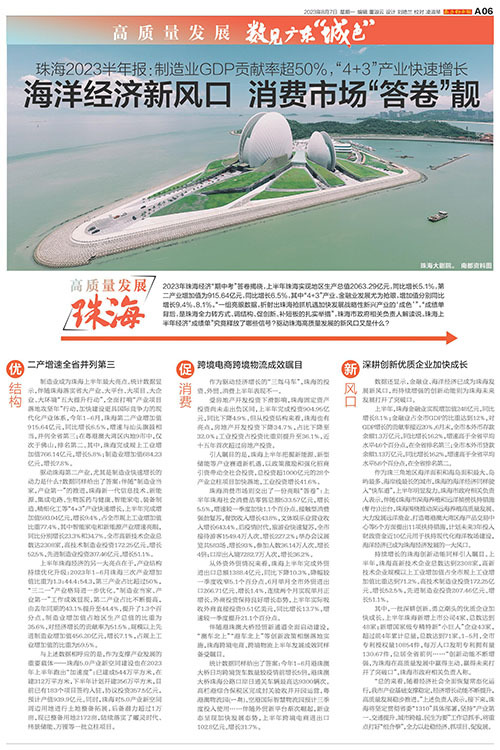2023年珠海经济“期中考”答卷揭晓,上半年珠海实现地区生产总值2063.29亿元,同比增长5.1%,第二产业增加值为915.64亿元,同比增长6.5%。