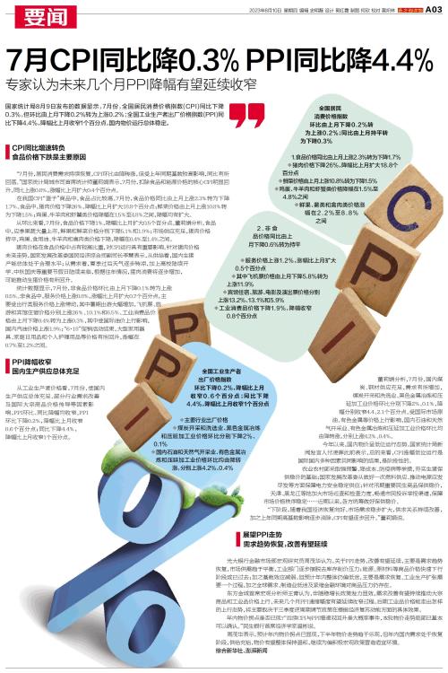 7月CPI同比降0.3% PPI同比降4.4%