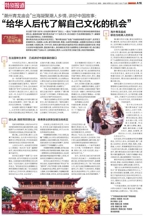 在法国“巴黎13区华人彩妆游行嘉年华”活动上,一面从广东潮州漂洋过海而来的旗帜现身巡游队伍,旗面绣制着“潮州青龙古庙”六个金色大字。