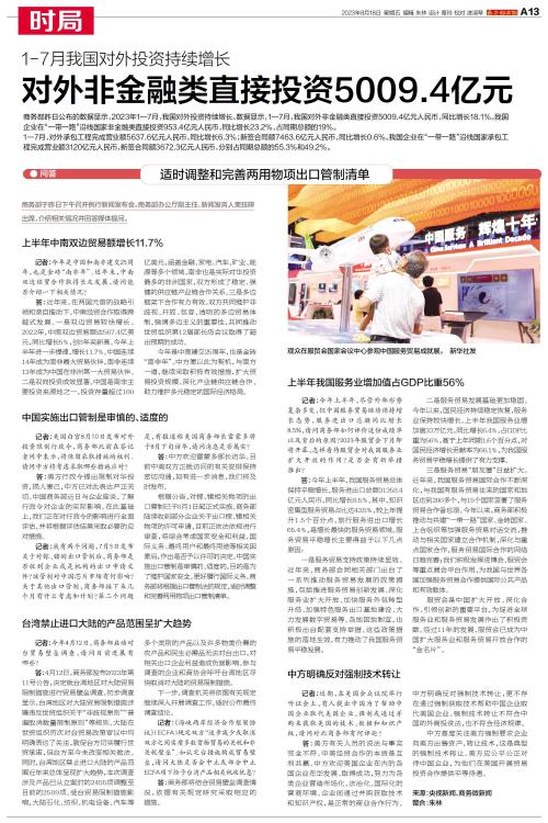 商务部昨日公布的数据显示,2023年1—7月,我国对外投资持续增长。