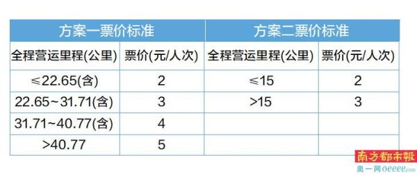 方案二,全程营运里程小于或等于15公里的线路票价为2元,大于15公里的线路票价为3元。