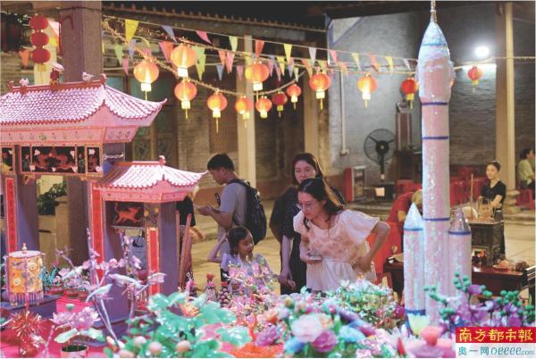 在明德堂“摆七娘”展示点,祠堂案台上既有传统的花鸟、佳果,也有现代的广州塔、火箭等作品,体现出巧姐们的心灵手巧。