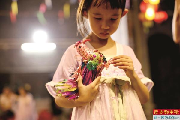 一名小女孩手捧传统乞巧作品。