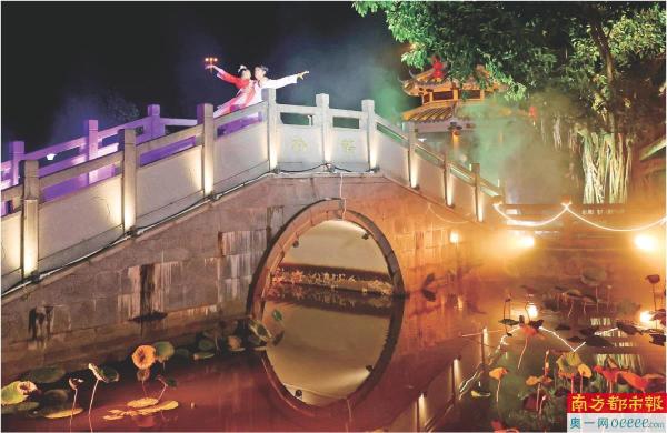 “鹊桥”上,“牛郎织女”演绎相会时的动人场景。