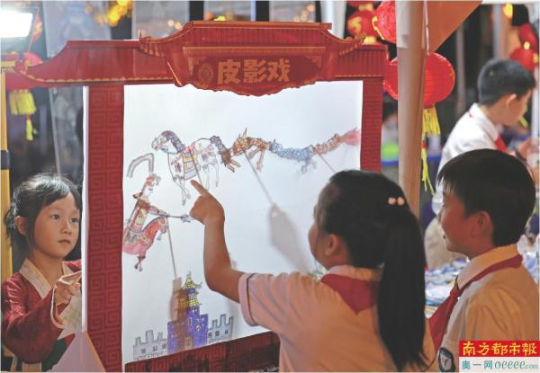 参加乞巧文化节的游客体验传统文化皮影戏。