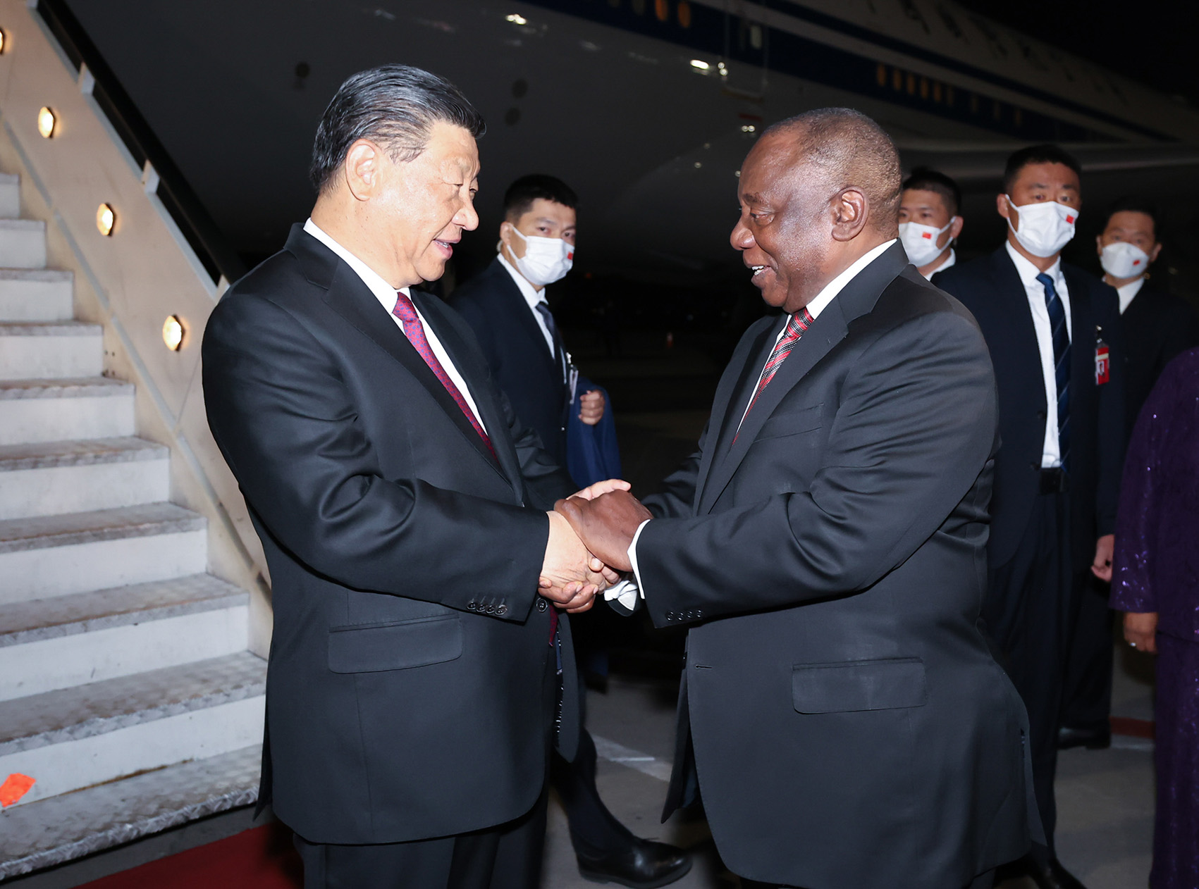 当地时间8月21日晚,国家主席习近平抵达约翰内斯堡,出席金砖国家领导人第十五次会晤并对南非进行国事访问。这是习近平在机场受到南非总统拉马福萨等热情迎接。 新华社发