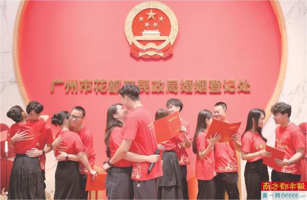为培育婚俗新风尚,共庆七夕佳节,广州市在花都区婚姻登记处为十余对新人特别举办了集体婚礼。现场,主办方为新人们颁发婚书,新人们持证拍照,进行集体宣誓,互诉爱意。