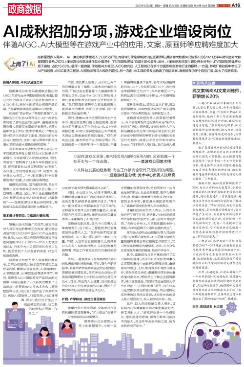 有多家游戏企业校招负责人表示,由于目前游戏开发过程中对AIGC的需求不断增长,今年新增了AI的相关岗位。同时,有游戏厂商明确了AI是今年秋招的加分项,更有甚者称AI是应聘者的“必考项”。不仅理工方向的游戏设计师、研发岗、程序员与AI相关,广告、影视等文科专业背景也有AI创意、AI游戏策划等岗位。