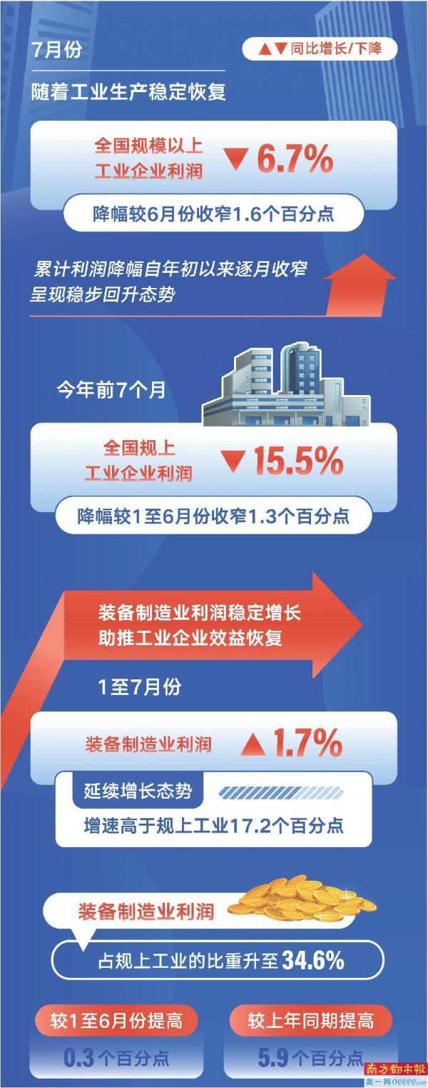 统计数据显示,今年前7个月,全国规上工业企业利润同比下降15.5%,降幅较1至6月份收窄1.3个百分点。7月份,工业生产稳定恢复,产销衔接水平明显提升,企业营收边际改善,盈利水平持续好转。