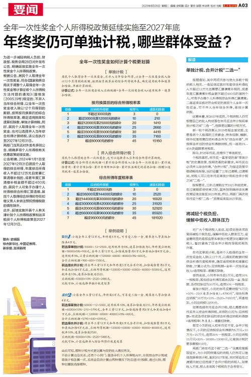 为进一步减轻纳税人负担,财政部、税务总局28日对外发布公告,明确延续实施全年一次性奖金个人所得税政策。