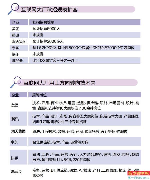 南都记者从上述企业的校招官网中随机抽取了约200个职位的招聘信息统计发现,今年校招的岗位类型中,技术大类职位占据了绝对优势。如美团在技术类岗位的招聘占比达到了36.5%;腾讯集团的技术类岗位甚至占到五成;淘天集团的技术类岗位占到43%;快手的技术类岗位分别归属于“工程类”和“算法类”,前者包含了数据研发、系统架构等职位类型,这类岗位占比达到28.5%,后者包括应用算法工程师、机器学习算法工程师等,占比达到约16%,合计技术类岗位占比达到44.5%,并且还开启了面向算法、工程技术同学的特殊人才项目——“快 star”。唯品会的技术类岗位占比也高达32.5%。可以发现,前述的技术类岗位占比在各家公司随机抽取的样本岗位中均居于首位。