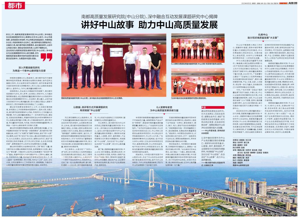 昨日上午,南都高质量发展研究院(中山分院)、深中融合互动发展课题研究中心揭牌仪式在中山举行。