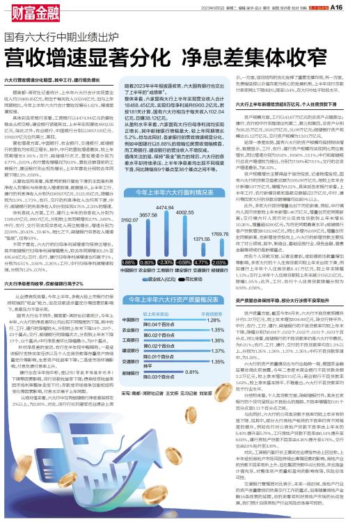 整体来看,六家国有大行上半年实现营业收入合计18468.45亿元,实现归母净利润共6900.2亿元。