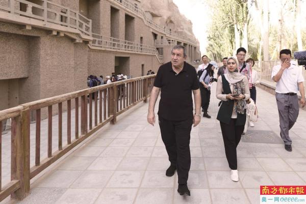 首届兰花奖“走读中国”系列参访活动,埃及前总理伊萨姆·沙拉夫等受邀嘉宾参观甘肃敦煌莫高窟。 段崴 摄