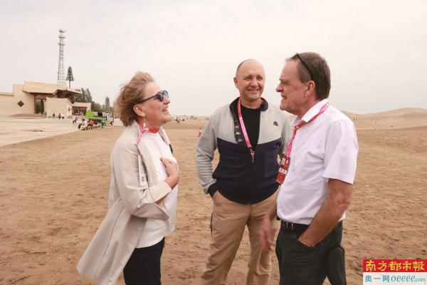 雷林科(左一)、易福成(中)、大卫·弗格森(右一)在敦煌鸣沙山月牙泉景区。 南都记者 莫倩如 摄