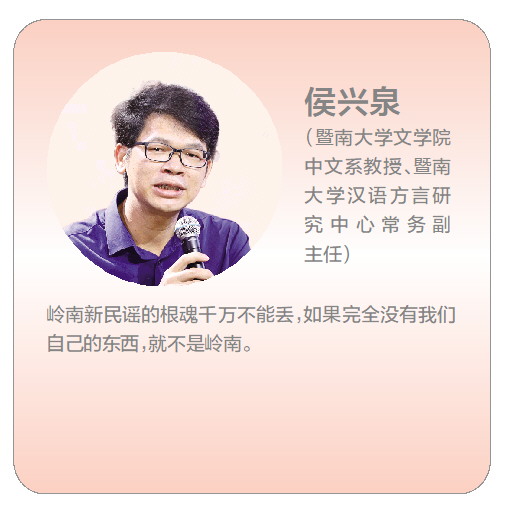“从歌词来说,方言就是根。”暨大文学院中文系教授、暨大汉语方言研究中心常务副主任侯兴泉表示,岭南新民谣不管内容形式如何创新,根和魂都不能丢,岭南的传统音乐元素同样不能丢。“广东有三大音乐,潮乐、汉乐和粤乐。如果完全没有我们自己的东西,就不够岭南。”